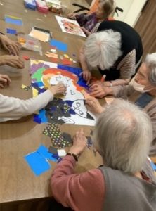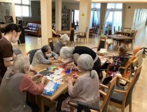 日中、みなさんお部屋で過ごされていることが多いので、お声がけして食堂へ出てきていただいて、塗り絵や貼り絵などしていただいています。