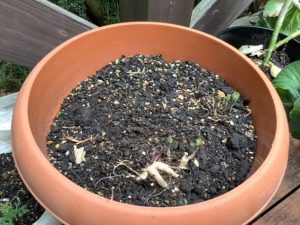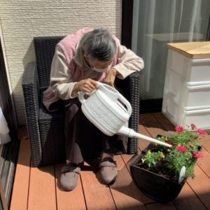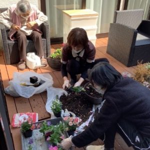 そこで、今回はベランダの花壇の植え替えを入居者様と行うことにしました。入居様の中にお花の手入れが趣味の方がいらっしゃり、とても手際よくされて、私たちスタッフが教えてもらっていました。